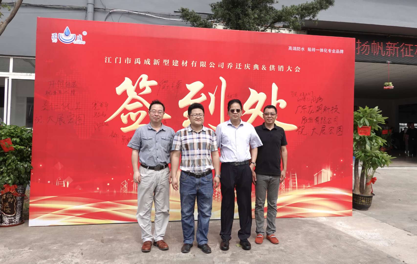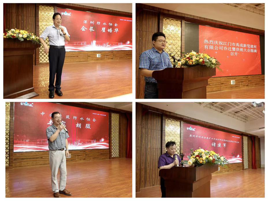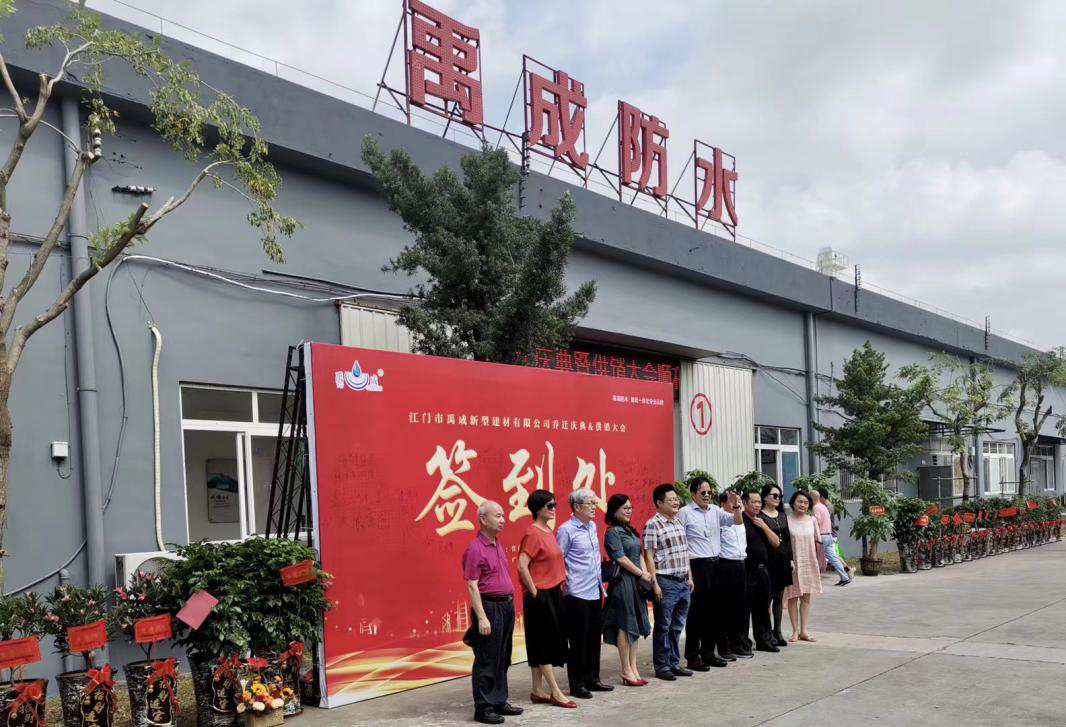 2020年7月26日,在眾多領導、行業專家、合作伙伴和朋友的見證下,禹成公司喬遷慶典暨供銷商大會在江門順利召開。慶典熱鬧非凡且隆重盛大,深圳防水協會會長瞿培華、防水專家胡駿、蘇州中材非金屬礦工業設計研究防水材料設計研究所褚建軍、防水專家易舉、陳少波、秦紹元、王瑩、李冬青、張慧敏、羅斯、王繼奎等出席了會議。