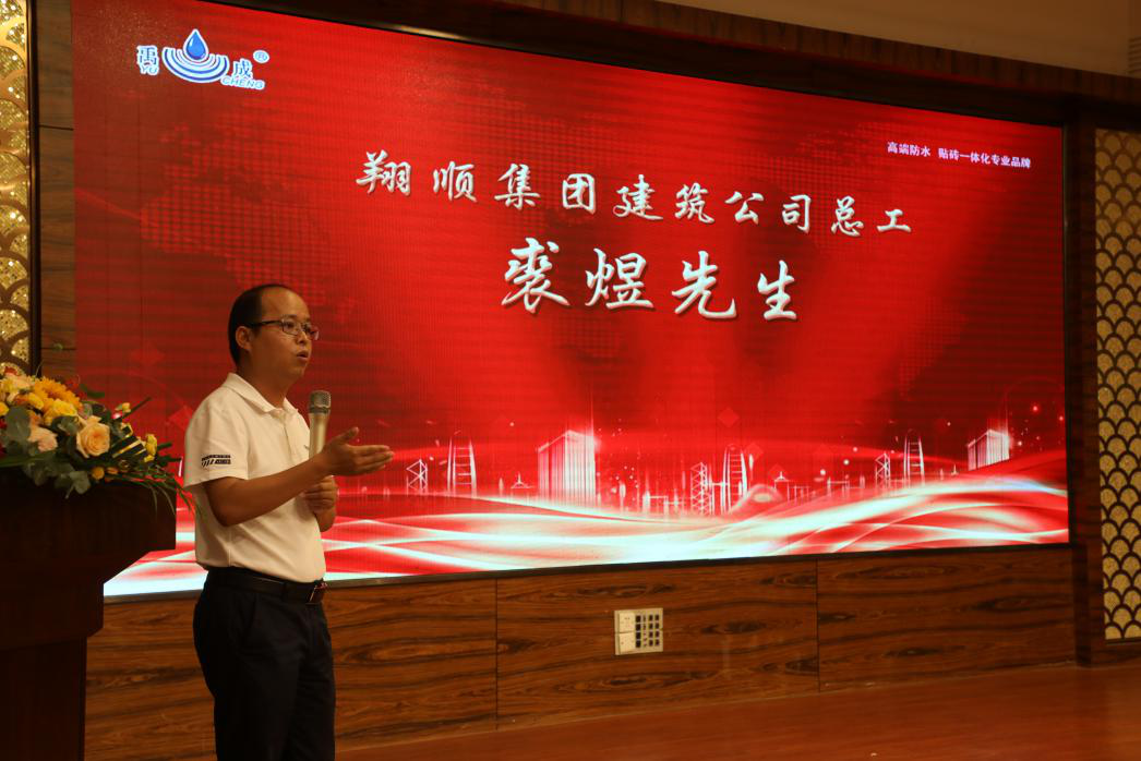 黃生輝董事長著重向大家介紹了禹成“一次成型外墻防水貼磚系統”,此系統是在禹成公司自主研發的《一種具有防水貼磚功能的瓷磚粘結劑》專利號:ZL201510609291.9的基礎上,推出的一種既能降低建筑荷載和成本,又能保證和提高外墻防水質量及瓷磚粘結強度的一種新型外墻系統。該系統能有效地的解決廚衛間立面、外墻等做了防水后貼磚出現的空鼓、脫落的問題,產品本身有很好的防水性能,同時又保持了瓷磚的粘結性能,將防水和貼磚一次性完成。
