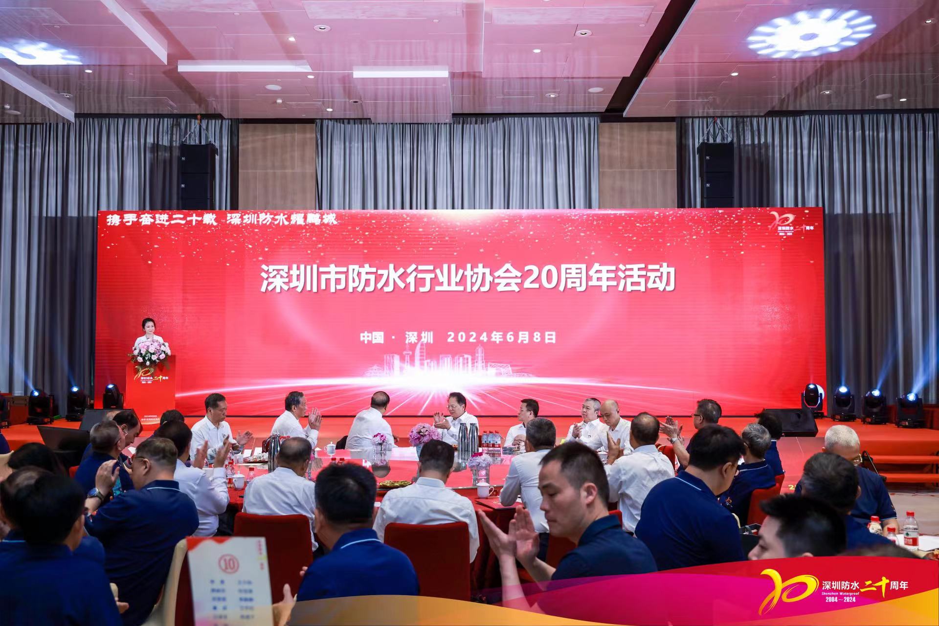 2024年6月8日,由深圳市住房和建設局、中國建筑防水協會指導,深圳市防水行業協會主辦的“深圳防水二十周年慶典活動”在深圳機場凱悅酒店舉辦,慶典主題為“攜手奮進二十載 深圳防水耀鵬城”,來自全國建筑防水及相關領域的領導、專家學者、企業負責人、深防協會員單位代表、相關服務機構代表等共400余人出席了慶典活動。