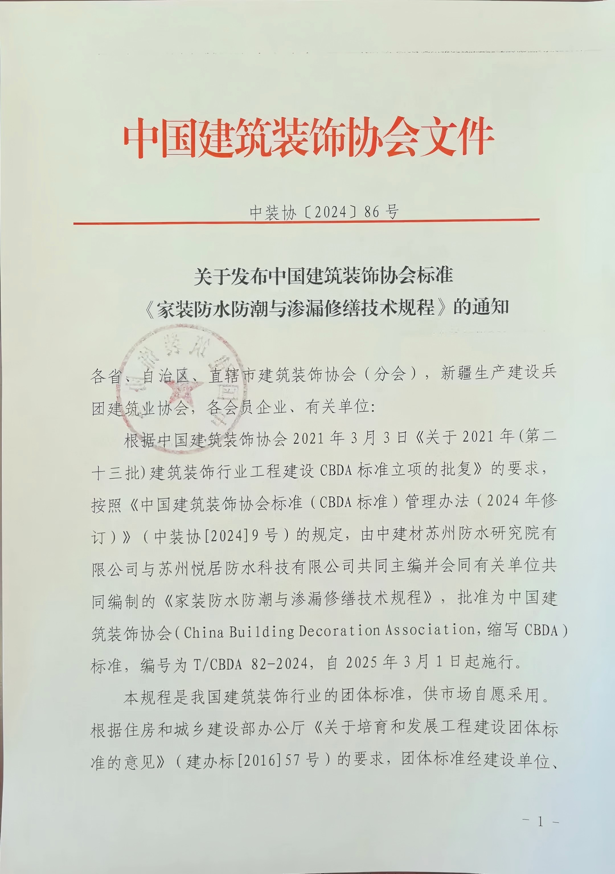 近日,根據(jù)中國建筑裝飾協(xié)會2021年3月3日《關(guān)于2021年(第二十三批)建筑裝飾行業(yè)工程建設CBDA標準立項的批復》的要求,按照《中國建筑裝飾協(xié)會標準(CBDA標準)管理辦法(2024年修訂)》(中裝協(xié)[2024]9號)的規(guī)定,由中建材蘇州防水研究院有限公司與蘇州悅居防水科技有限公司共同主編并會同有關(guān)單位共同編制的《家裝防水防潮與滲漏修繕技術(shù)規(guī)程》,批準為中國建筑裝飾協(xié)會(China Building Decoration Association,縮寫CBDA)標準,編號為T/CBDA82-2024,自2025年3月1日起施行。