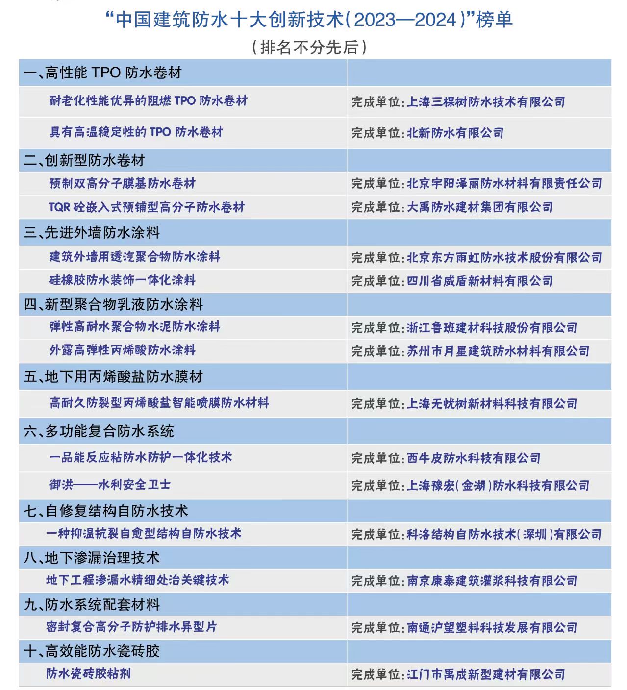 本屆大會大咖云集,星光閃耀,開幕式后陸續揭曉了行業相關的各類測評榜單。江門禹成憑借著多年的防水行業深耕經驗,